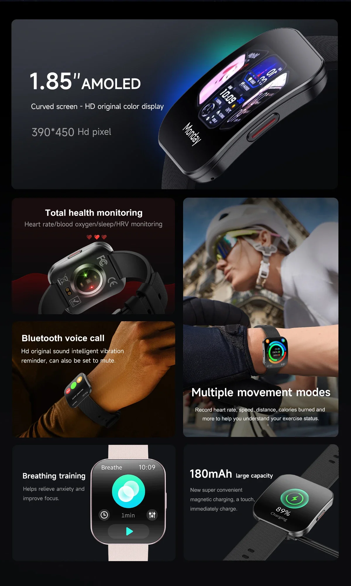 3D dynamic menu,Dynamic background,Bluetooth calling, Always-on Display,voice assistant, Bluetooth music, step counting, exercise distance, calorie consumption, heart rate detection, weather forecast, multi exercise mode, Scientific Sleep Monitoring,message reminder, sleep detection,HRV, stopwatch, timer, alarm clock, respiratory training, finding phone, sedentary reminder, smart alarm clock, female physiological reminder, etc.