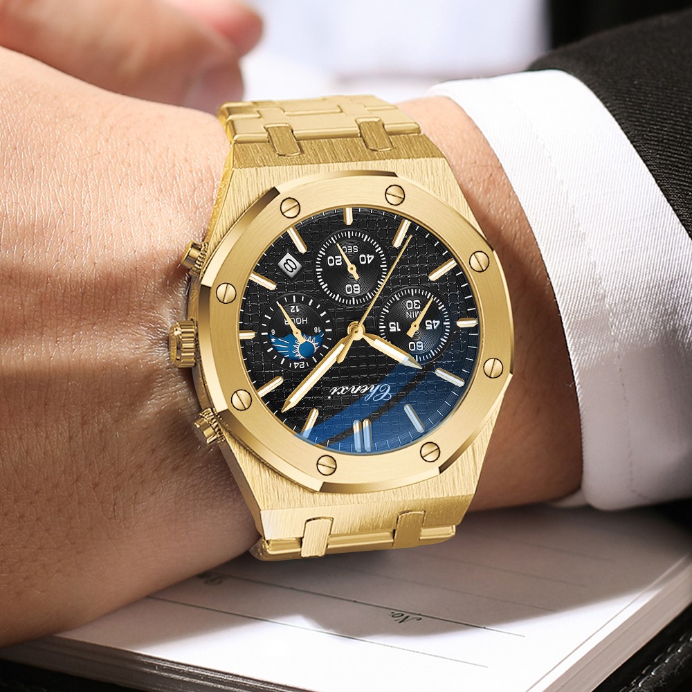 Luxury Gold Watches for Men Royal Stainless Steel Waterproof Chronograph Golden Business Casual Male Quartz Wristwatch