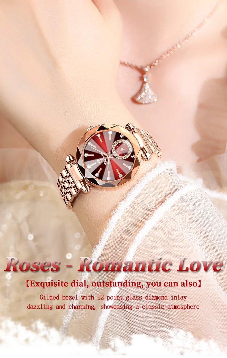 Red Rose Gold Stainless Steel Women Gift Clock Watches