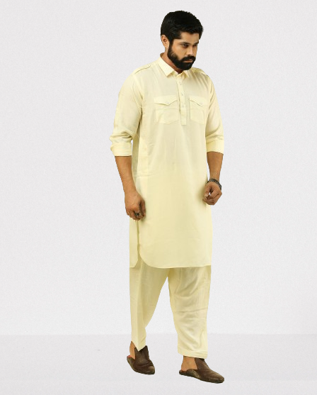 Traditional Pathani Khan Suit Set in Soft Comfortable Feel Cotton fabric. It has shoulder flaps, two buttoned pockets, cuff plus rollover sleeves and relaxed fit salwar Patiala pyjama.
